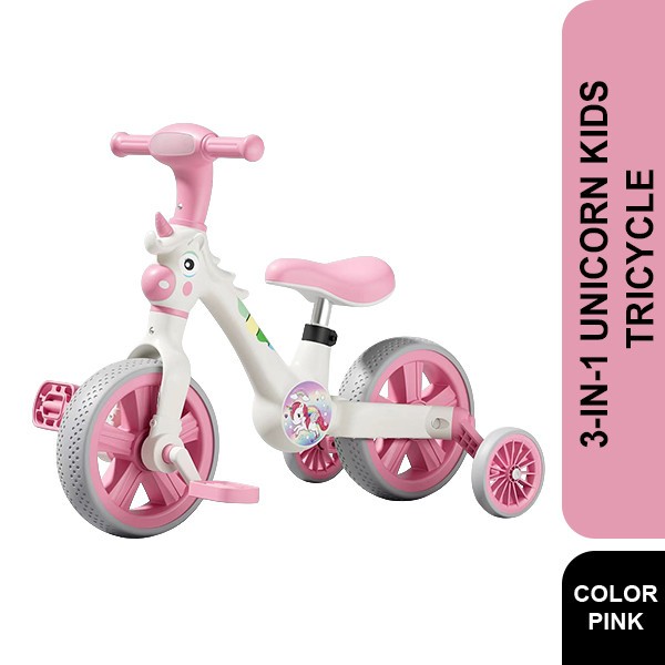 Make playtime magical with this 3-in-1 Unicorn Kids Tricycle (Pink). Designed with a cute unicorn theme and attractive pink color, this tricycle is perfect for toddlers learning balance and coordination.